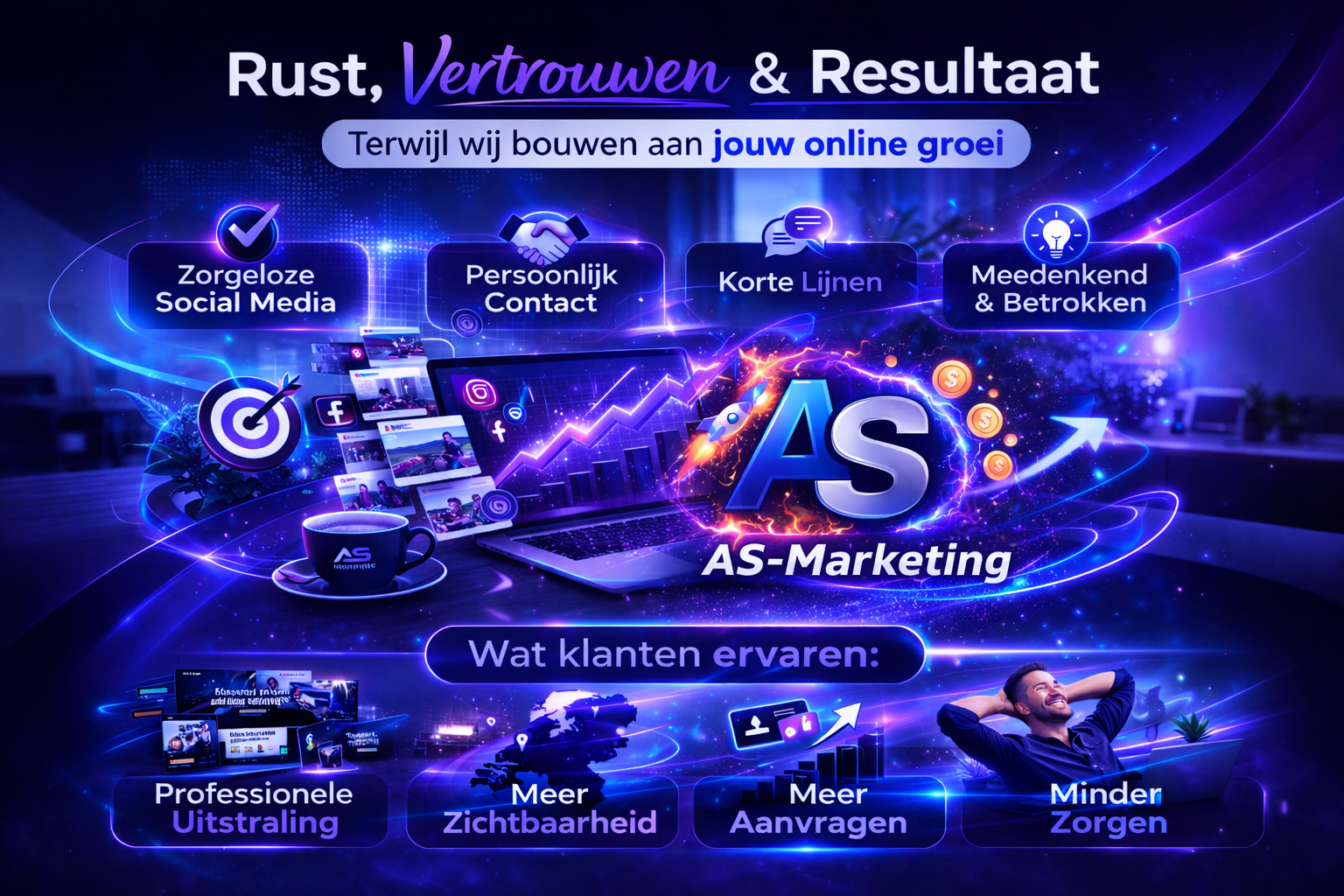 Wanneer klanten met AS-marketing samenwerken, wil ik dat ze vooral rust en vertrouwen ervaren. Rust, omdat ze weten dat hun social media goed geregeld is. Vertrouwen, omdat er duidelijke communicatie en korte lijnen zijn. Ik wil dat klanten merken dat ze niet met een afstandelijk bureau werken, maar met iemand die meedenkt en betrokken is bij hun groei. Het resultaat moet zijn: een professionele en sterke online uitstraling, meer zichtbaarheid bij de juiste doelgroep, meer aanvragen en kansen, en minder zorgen over social media. Mijn doel is dat klanten trots zijn op hun online aanwezigheid en merken dat het daadwerkelijk iets oplevert voor hun bedrijf. Samen bouwen we aan groei — op een duidelijke en nuchtere manier.